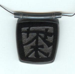 I was playing around with a chip of jet one day when I noticed that it was roughly the shape of a kanji character. I don’t know why, but the rest of the project just followed from there. The carving is set in blackened silver, and is padded with tea leaves pressed into the setting.