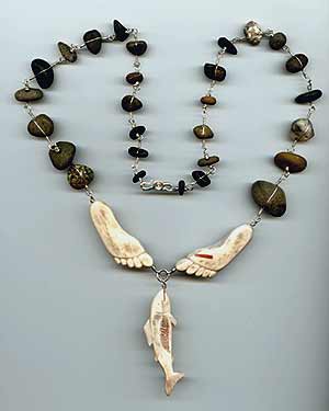 Sterling silver, caribou antler, glacial gravel, alabaster, and pipe stone. – NFS