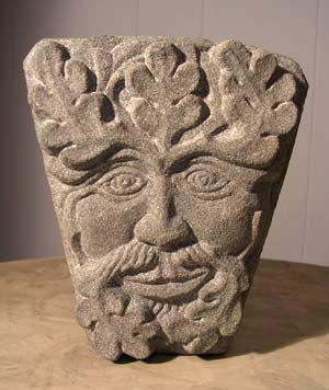 This is a smallish trial piece, a keystone about the right size for the shorter sort of red brick. I wanted to work out the details of carving the stylized leaves, and making them work with the facial features. I would welcome custom work of a similar nature.