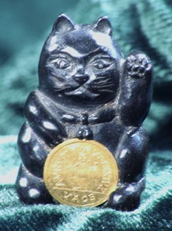 I have long been fascinated by the folklore of the beckoning cat, and have wanted to carve one for some time now. I also like the image of the black cat with the gold coin. In this case the cat is carved from a block of jet, a variety of carveable coal. The coin is slightly oval, and the front of the cat was made so that I could insert the coin and turn it until it stuck fast.