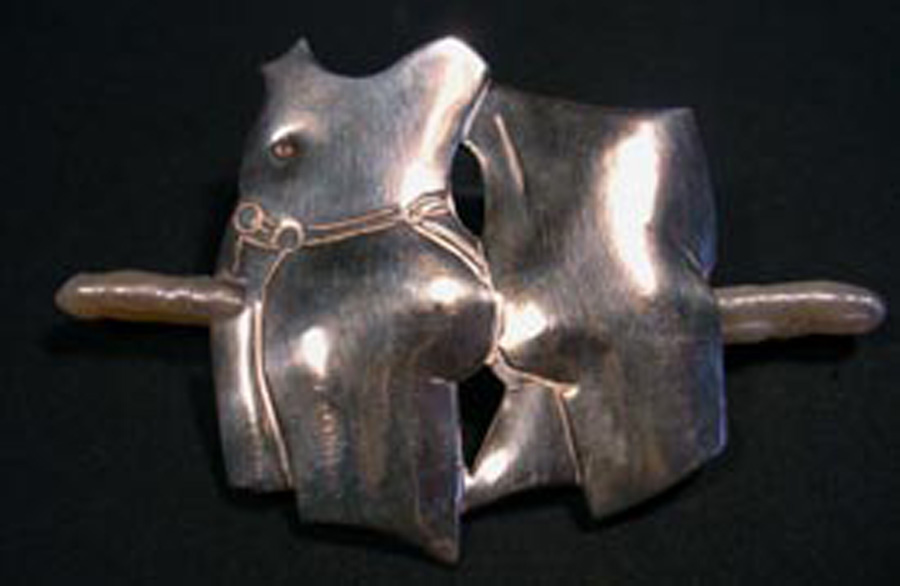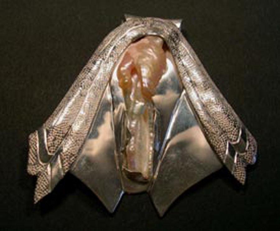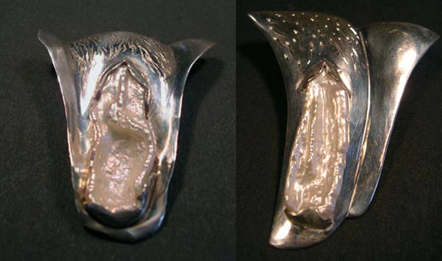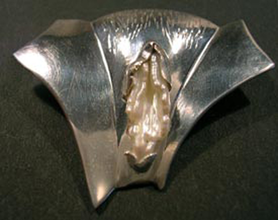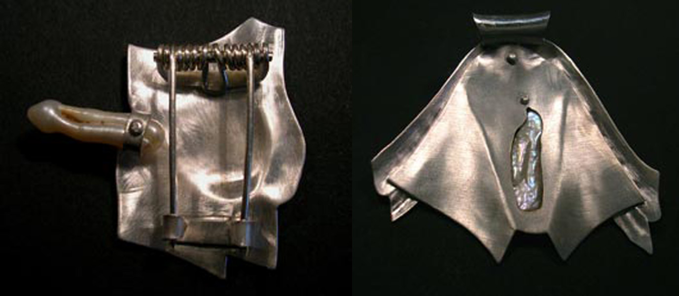 For the findings on back of the Butt Pin, a spring tensioned double pin arrangement gives an extra secure fastening. The rivet that holds the pearl in place can be seen at left. On the back side of Towel, you can see the layers of metal, the hammer formed bail, and the rivets that hold the hand shaped pearl in place. The cutout reveals a bit of the back of the vulva shaped pearl.