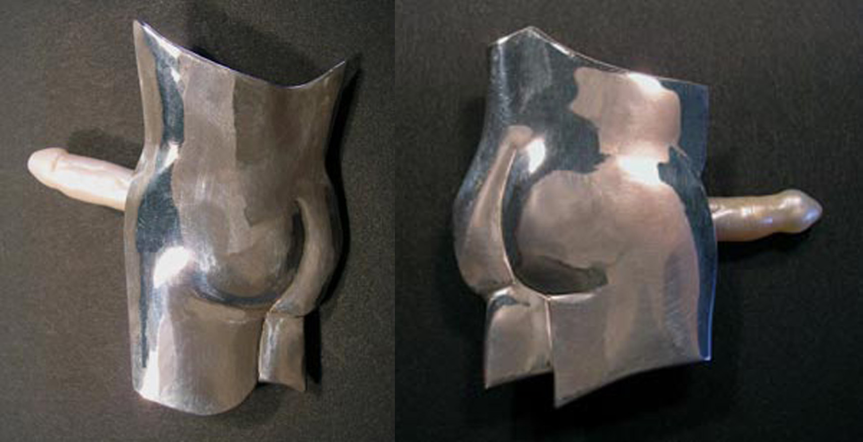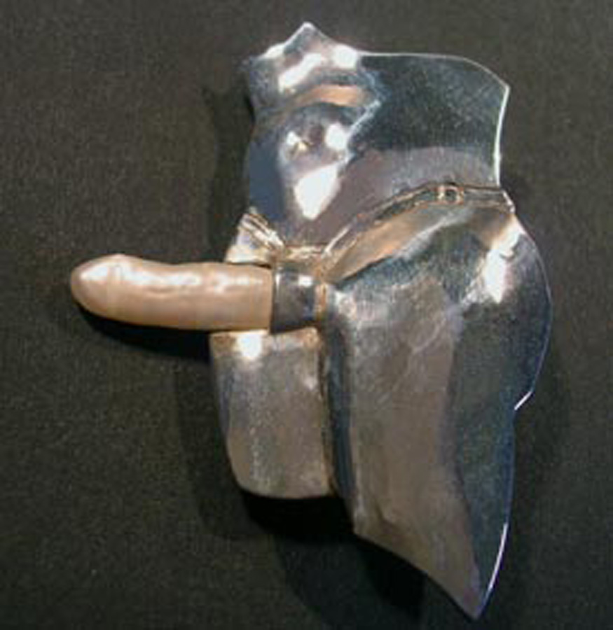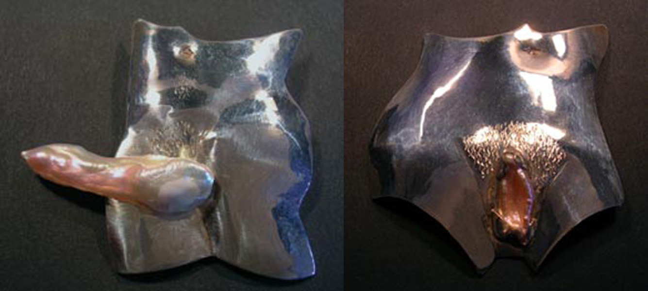 The amusing thing about this pin is that it is all one pearl. The penis, and the strap-on are simply the opposite ends of one very long pearl.
