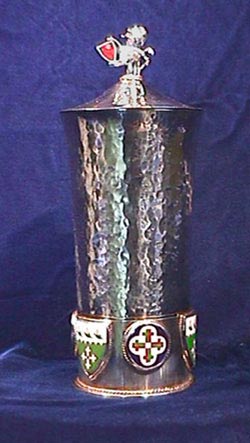 The bulk of the metalworking on this project was fairly straight forward. There were two main challenges. The first was making enamels curved to conform to the curve of the bottom of the beaker. I got through this one by making forms from firebrick on which to fire them. The second was the little white gold lion holding the enameled shield and wearing the enameled crown. I ended up making the head separate, and with a little cut away area to accommodate the crown. A pin secures the head through the body of the lion, and into the lid. There is a rock crystal set on the inside of the lid over a medallion struck with the same heraldry as on the enamels.