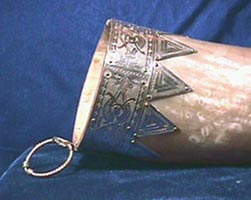 I make a great many drinking horns, most custom, but these two are a good example of the sort I usually do. In both examples the fine lines are engraved, while the textures, and larger markings are done with punches. The silver parts are fixed to the horn with tiny brass rivets, and I nearly always provide a ring by which the horn can be hung, The lining is beeswax, so these are not good for hot drinks, however if they do get nasty the wax can be removed with hot water, and then replaced.