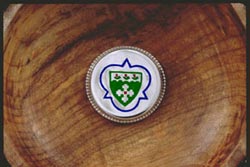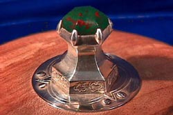 The lids on these maplewood mazers are each turned from same block of wood as their bowls so that the grain matches up at the seam. The curved and tapered base of each mazer is six sided, and is fabricated from fifteen seperate pieces of silver. They were quite challenging to put together. The bowls are lipped with silver, and have a small notch to make sure the woodgrain is properly aligned. The lids are decorated with champleve enamels, and have edge catches in the shape of fluer du lis. The handles are also six sided, and set with bloodstone that I cut special for this project.