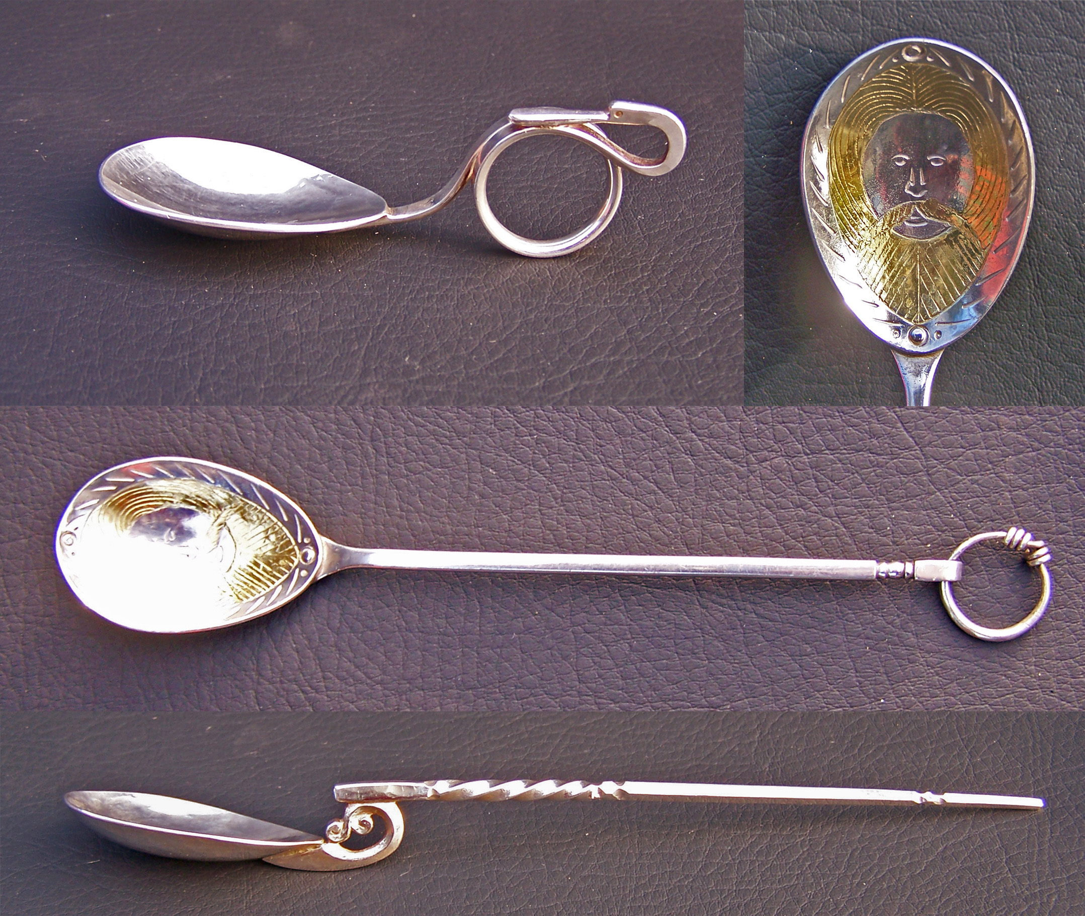 Ever since the discovery and publication of the Thetford Treasure people have been asking me to make historically inspired spoons for them. These are all sterling silver, though the one with the engraved face has been gilded. The spoon at bottom is very typical of late Roman table ware, as is the spoon with the looped handle with the Duck shaped terminal.