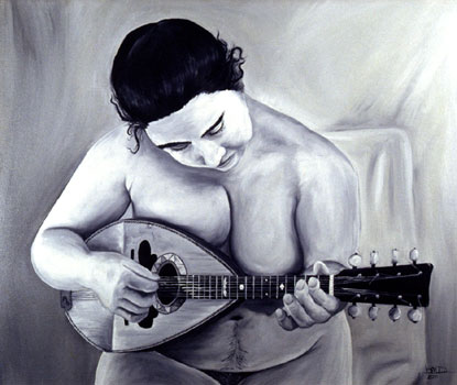 These next two paintings are nudes of the musician, Jenny Anderson, playing her mandolin, which she says is old enough to be her great grandfather. In the first painting Jenny is clearly the subject. I was looking at the way that she loses herself in the music when she is playing. In the close up painting I wanted to blur the line between subject and context, asking is this a painting of a musician playing, or of an instrument, with the musician’s body as the backdrop? And further, from where comes the music, as neither makes it without the other.