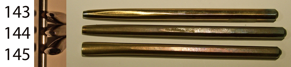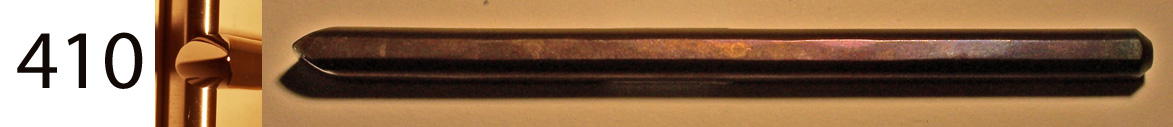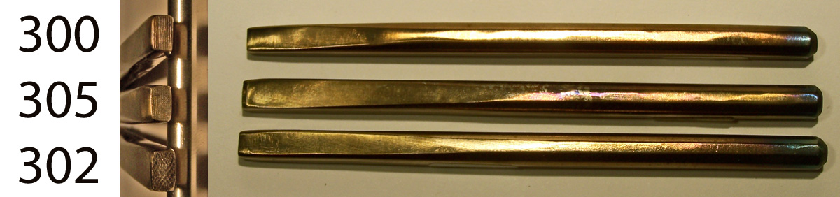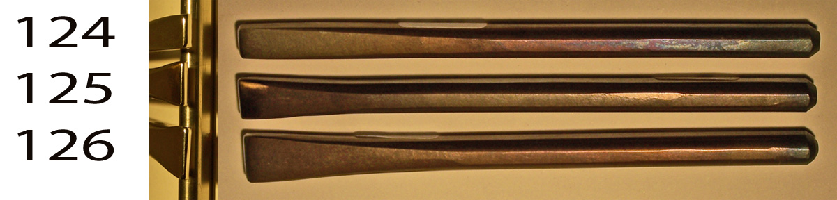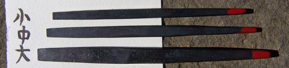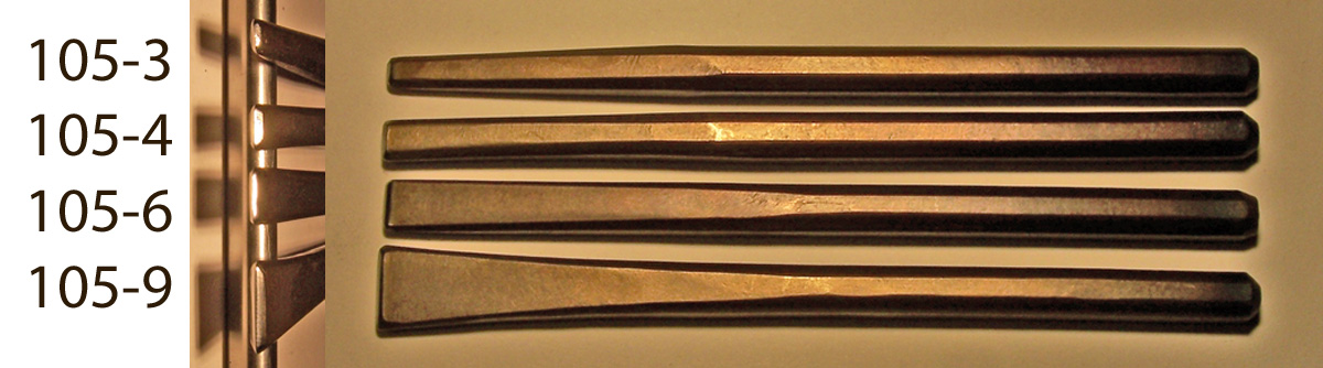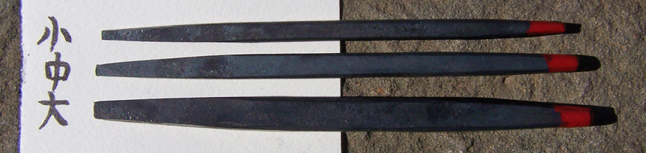 In Japan goldsmiths make most of their own punch tools gravers and chisels from this sort of preshaped tool blank. I make these tegane blanks in the traditional way, forging them by hand, one at a time in a charcoal fire. Both ends taper so that the point of hammer contact is aligned with the working tip. They are annealed and treated with camellia oil, so the tips may be shaped directly with a file before hardening, or heated and hammered to shape. Heat treating is simple, just quench in water, and temper to whatever hardness in required. After heat treating the tips may be polished or honed to the final shape and finish. You can find them for sale below with both square tips and rectangular tips, each in large medium and small sizes. Small-$10. Medium-$13. Large-$15. Ask about discounts for large purchases.