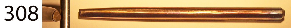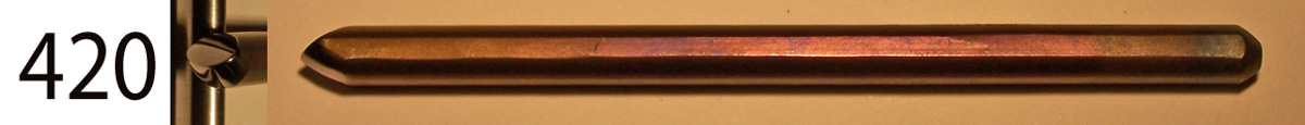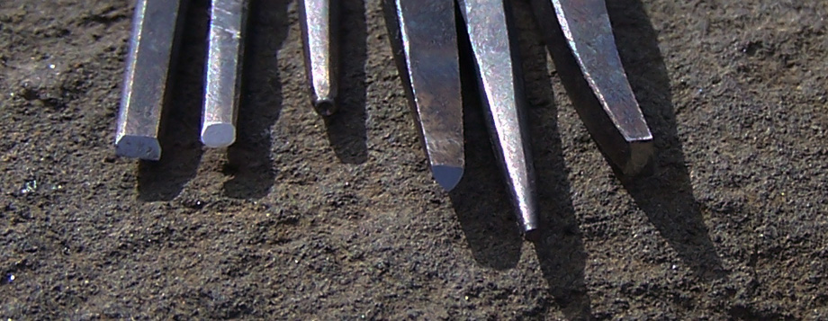 All the punch tools in this section are made from W1 tool steel, which has been hardened and tempered before finishing. The hammer end has been softened so as not to mark the hammer face. They are about 4” long, by 1/4” wide, and most are roughly octagonal in cross section.