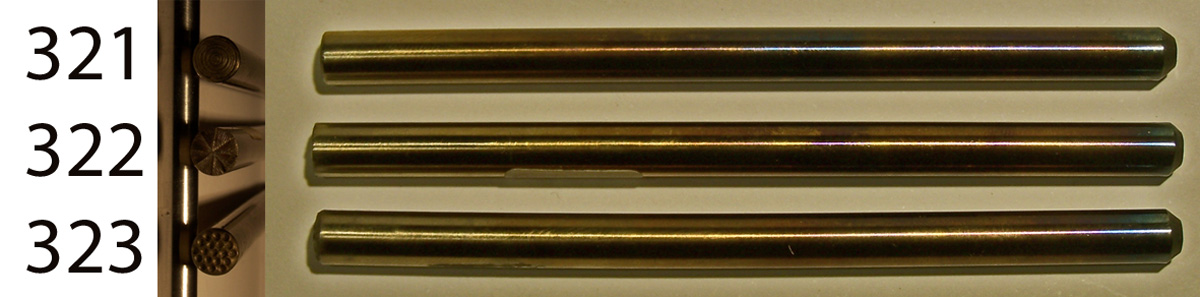 These tools have a round shank, and a slightly domed face, with fancy texturing patterns. Tool 321 has a concentric circle, or rain on the water pattern, that can be used in all sorts of ways, including creating fish-scale patterns. Tool 322 has a radial mill-wheel pattern, that can make all manner of radial, and star-like designs. And tool 323, has a honeycomb pattern, that can be used for all sorts of bold textures. $35 each