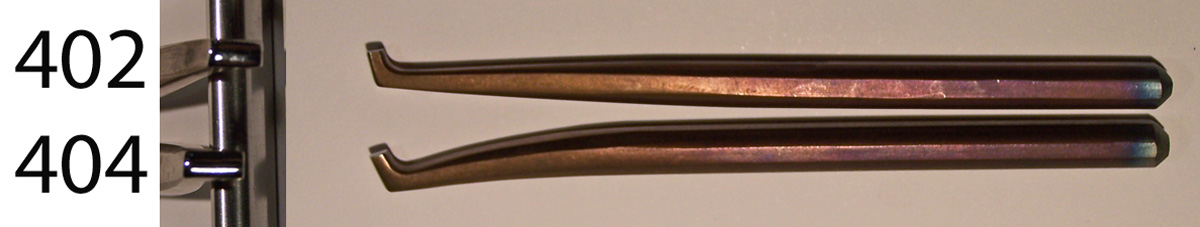 These tools have a working face that that is more or less rectangular, 3 mm by 5 mm, with a raked angle in one axis, and quite rounded in the other. The shaft has been cut away a bit behind the leading edge, which has been polished right back to the cut out. They are often used for planishing the vertical surfaces along the edges of recessed areas. Tool 402 has a straight shank, while tool 404 curves to reach into even more challenging areas. $30 each