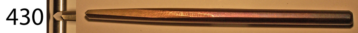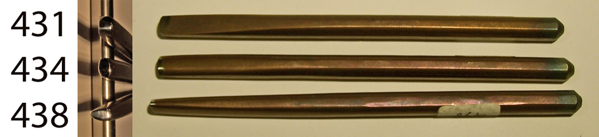 These tools are sometimes called “butchers”, or “skews.” They have a working face that slopes from a crisp edge back to a more rounded edge. This allows the artist to punch one side of a sketched line down and leave the other at its level, without first cutting the line into the metal. On Tool 431 the crisp edge is completely straight, on tool 434 it is slightly curved, and on tool 438 it is a tight curve, to make inside corners. $25 each
